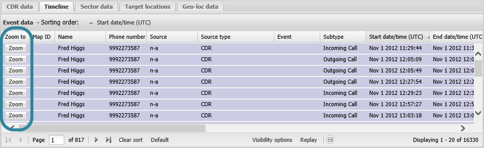 The Timeline tab displays, in UTC time order, the information from the uploaded CDR files, phone data files, geo-location files and the target locations. Only the phone data information and target locations that contain a time are displayed. The records are shown in the color you have selected for each phone number using the Color selector.