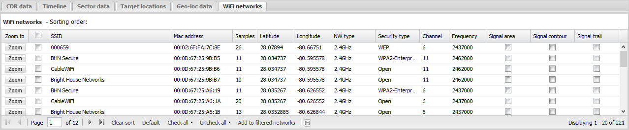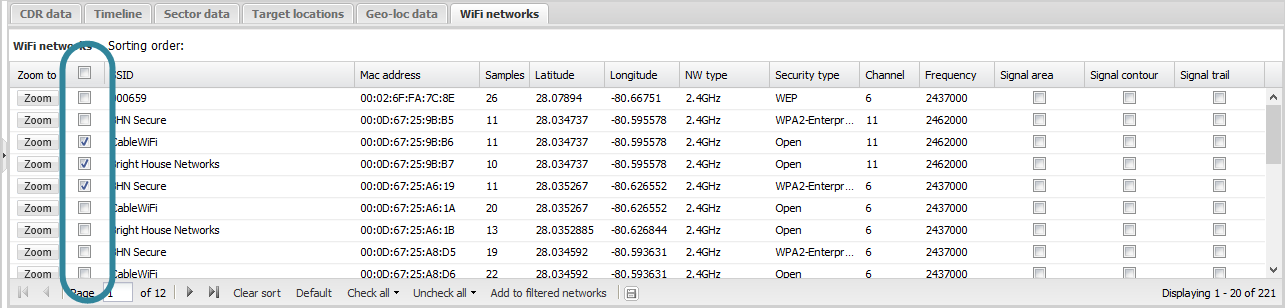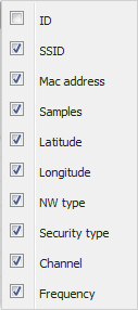 The Signal area, Signal contour and Signal trail columns allow you to display the results from the drive for each WiFi network SSID. If there is no check box displayed in the Signal area or Signal contour columns it indicates that there were not enough measurements during the drive to determine them. Check all and Uncheck all allow you to select and clear respectively each of these columns for the current page of data.