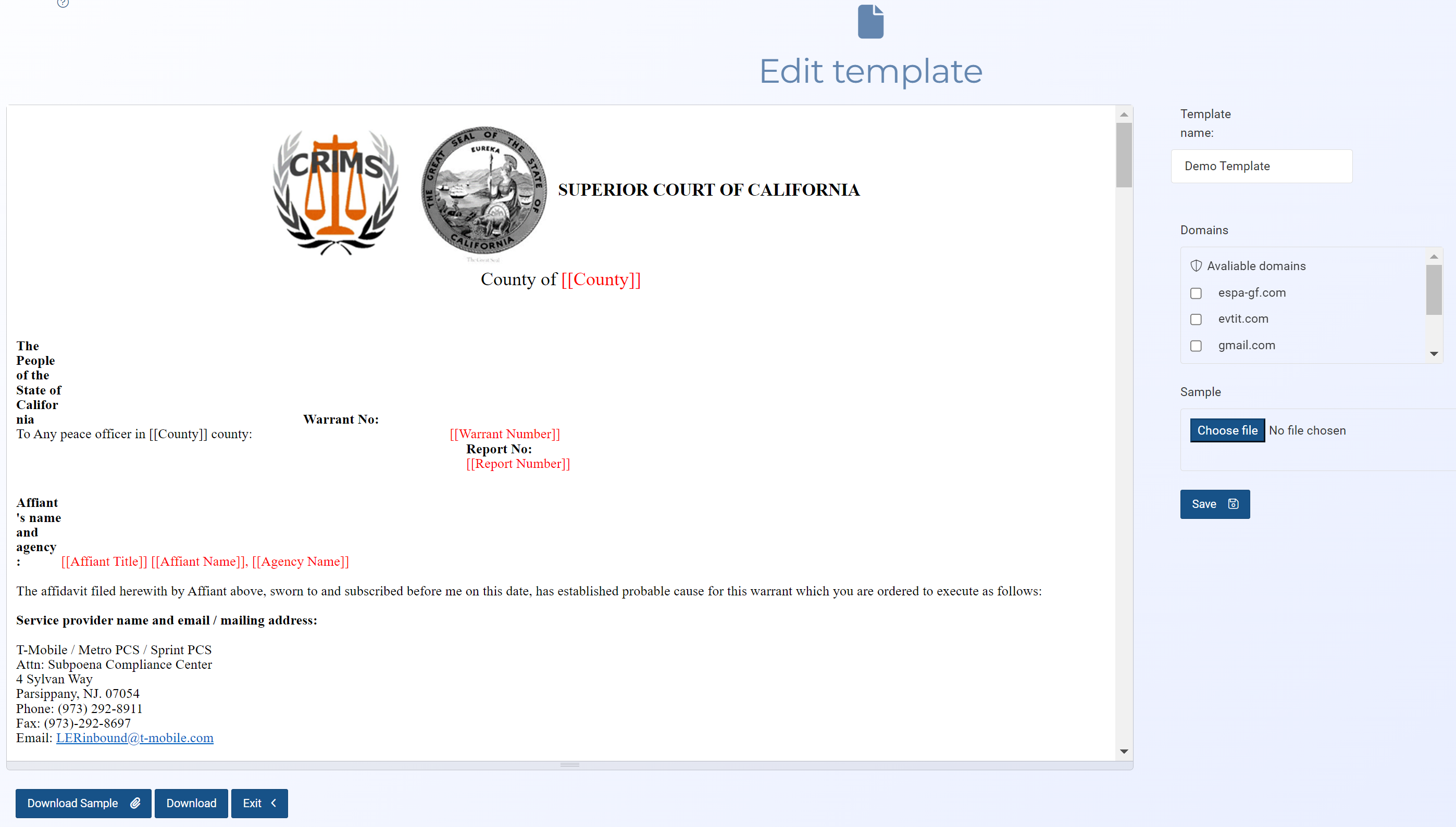 The Edit template screen allows you to make changes to the template. Templates help to efficiently create documents such as detailed search warrants to one page CALEA sheets. Templates are firstly created by administrators or a user who has the Templates manager permission identifying key words or sections that are then completed by an individual user. Users can apply the templates to a case by clicking Templates on the Manage case screen and can also use templates without an associated case from the main menu by selecting Templates then Manage non-case templates. If your OSS-ESPA account also supports the OSS-SRN Express Portal then these templates are also made available to users of the OSS-SRN Express Portal.