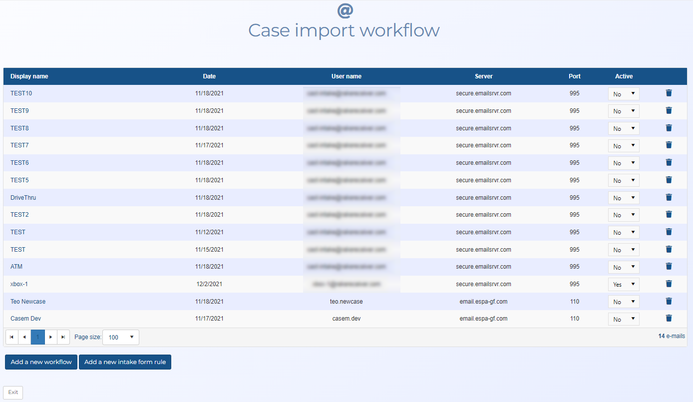 The Case import workflow screen is used for the workflow automation that automatically creates cases from either emails or the OSS-SRN Express Portal. The screen lists all the defined workflow automation and intake form rules created using the Case import workflow configuration screen and Intake Form rule screen respectively. The screen also allows you to delete the workflow or rule, and set whether or not they are active.