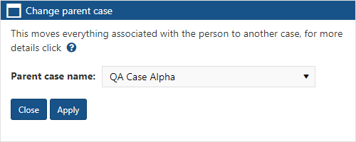 The Change parent case dialog box allows you to move a person's details to another case. This includes moving the person, their phone numbers, their i-cases and all their intercept messages. It is permanently noted on the Case Notes View screen of both the old and new case that the person has previously been moved, and there is also a temporary notification alarm on both cases. Moving a person's details to another case can take some time depending on the amount of data that needs moved and during the process the data is unavailable until the move is completed.