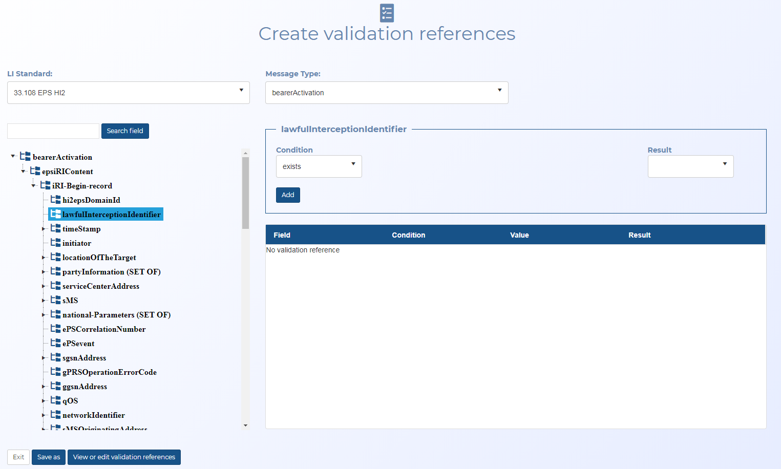 A validation reference consists of: a specific Lawful Interception (LI) standard, a specific message type from that LI standard, and one or more rules. Rules are a series of parameter or value identifiers, with an associated condition and result. When you save a validation reference you can enter a validation reference name which is meaningful to you.