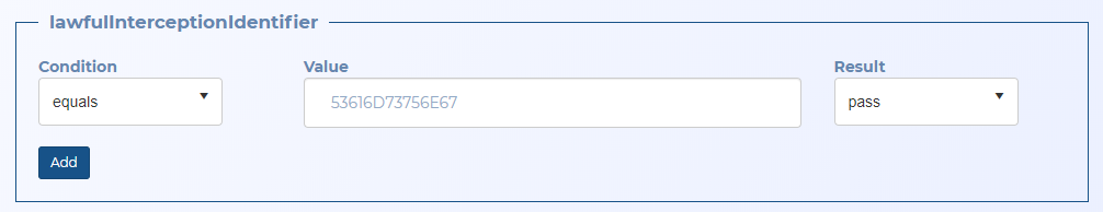 In this example, if the i-case's lawful interception identifier is Samsung, the ASN.1 decoded value is octet string of "53616D73756E67". You cannot use the string "Samsung". It will always fail because the value checked is an ASN.1 decoded value, which is an octet string.