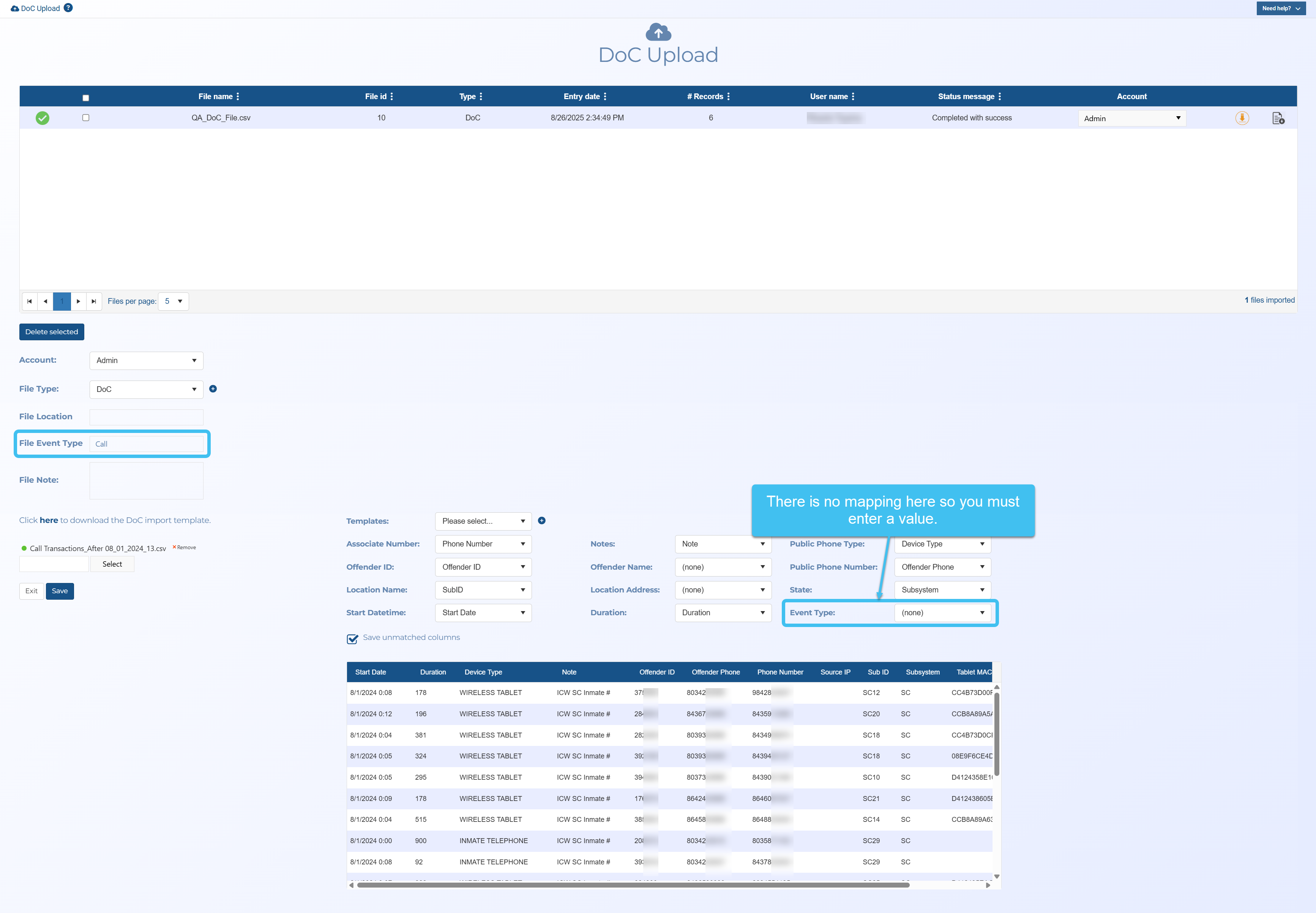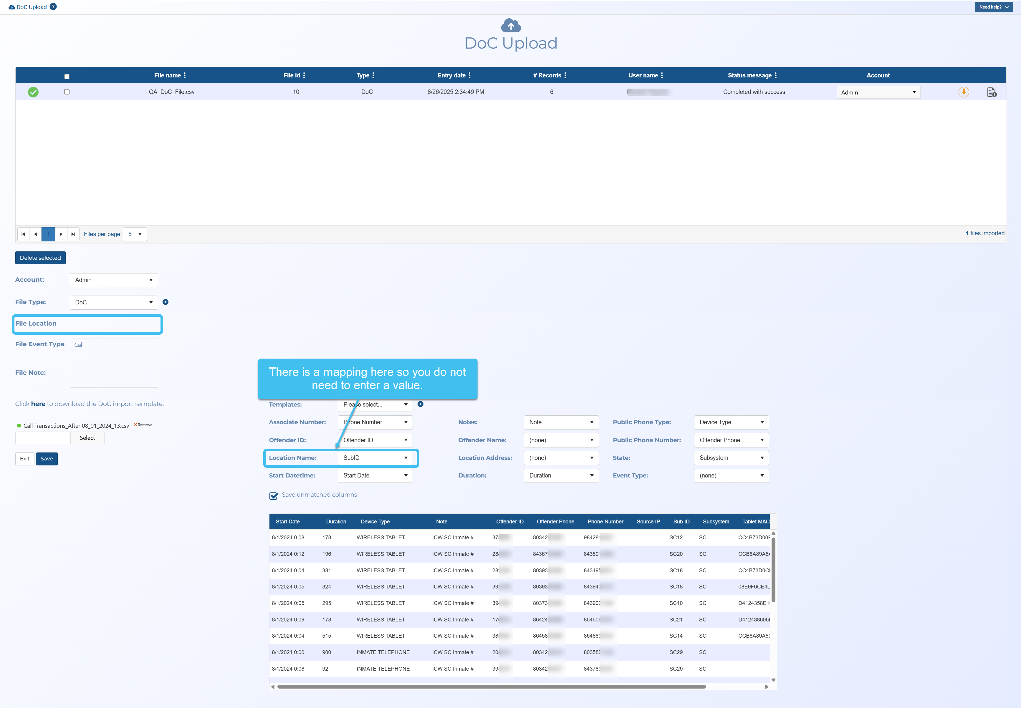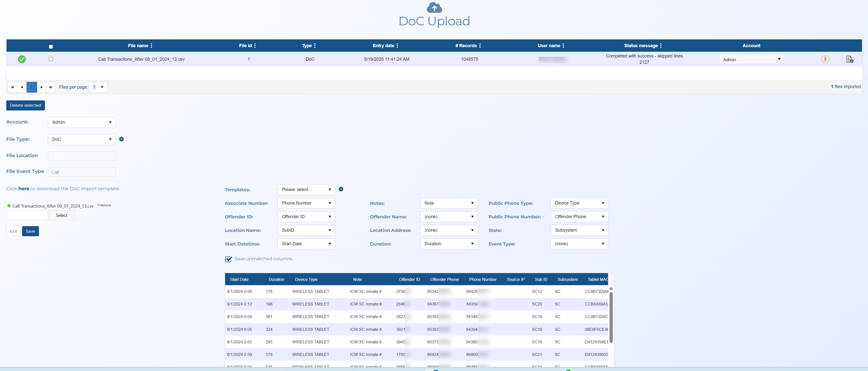 The Doc upload screen allows you to upload a file containing calls between incarcerated offenders and their associates. Also known as jail calls, inmate tolls and prisoner call details. These calls are obtained from correctional facilities that monitor the inmates calling activity.