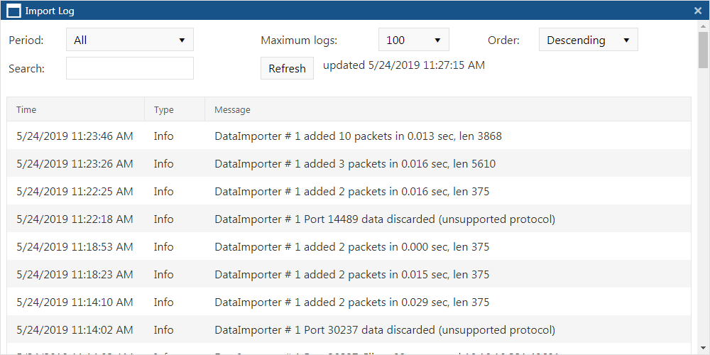 This topic provides an overview of the Import log and Packet inspection log dialog boxes and all the settings and buttons on them.