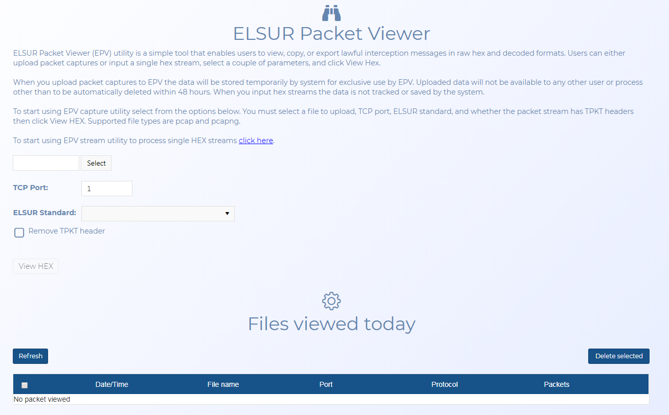 When you upload packet captures the data is stored temporarily by OSS-ESPA and is listed on this screen. The uploaded data is used exclusively by the ELSUR Packet Viewer and is not available to any other users or OSS-ESPA features and it is automatically deleted within 48 hours. When you input a single hex streams the data is neither tracked or saved by OSS-ESPA.