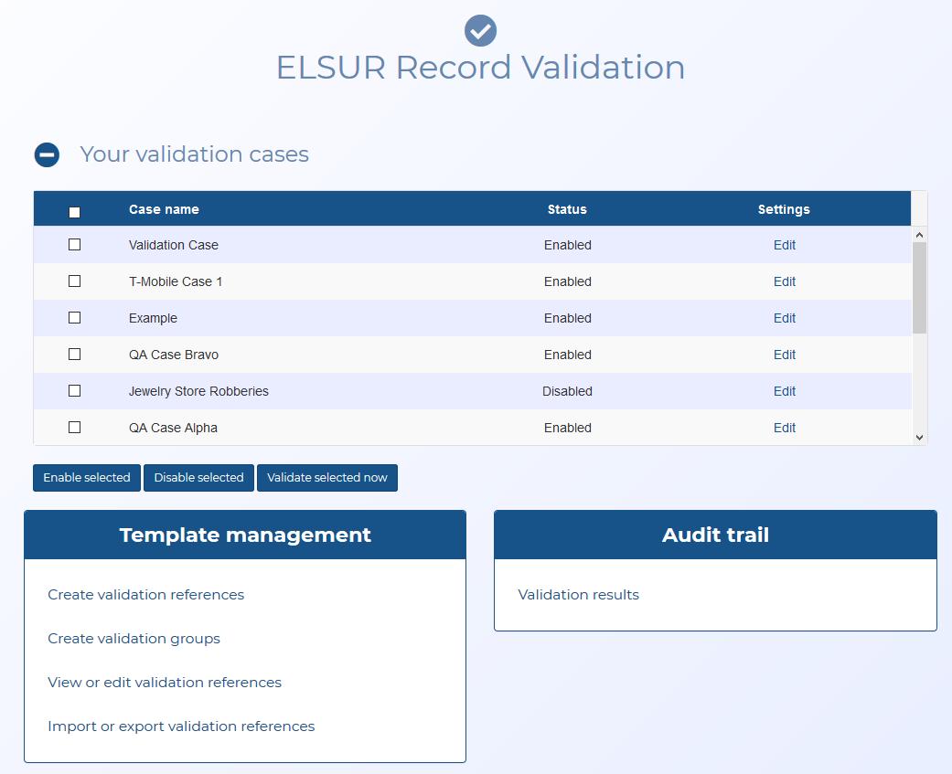 Click to view and manage the ELSUR record validation results. Refer to Validation results screen and Viewing, exporting and deleting ELSUR validation results for further information.