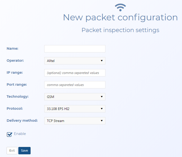 The New packet configuration and Edit packet configuration screens are used to define packet inspection configurations for your listening intercept monitoring ports. The operators define these ports and Gladiator Forensics includes the ones which are standard. It is rare for the operators to change these configurations but this screen allows you to manage these settings as required.
