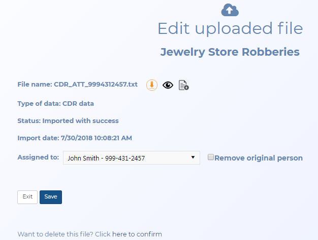 This topic provides an overview of the Edit uploaded file screen and all the settings and buttons on it. However if you require step-by-step procedures on reassigning or deleting files refer to To reassign a file such as a 999-999-9999 number or To delete a file respectively.