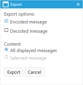 The Export dialog box is used to export lawful intercept messages that you have uploaded as packets using the ELSUR Packet Viewer screen. It allows you to select whether the export includes encoded or decoded messages or both. It also allows you to select whether you export all the messages in the packet or just the one you currently have selected.