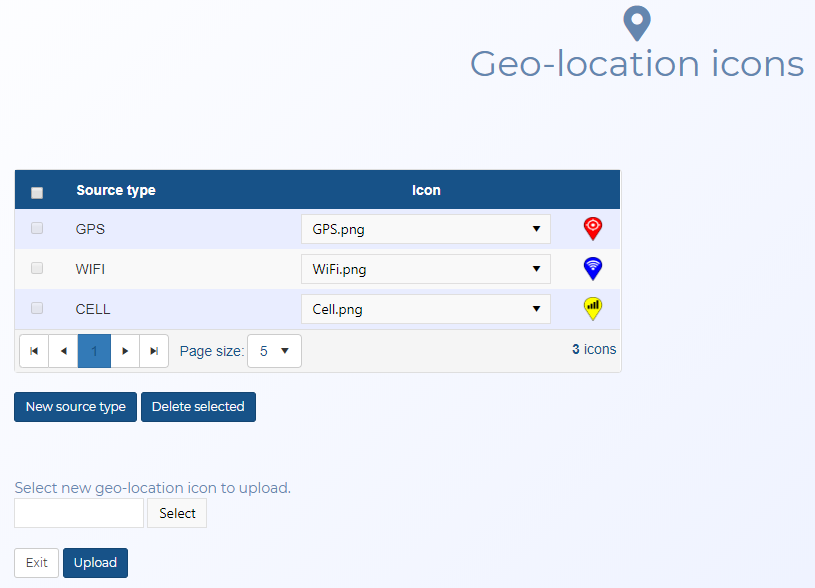 The Geo-location icons screen allows you to define which geo-location icons you want used for each geo-location source. These geo-location sources are defined in your uploaded geo-location file. The screen also allows you to define your own source types and upload your own icons, which you can then select. These icons are then used in the IQ packet reports