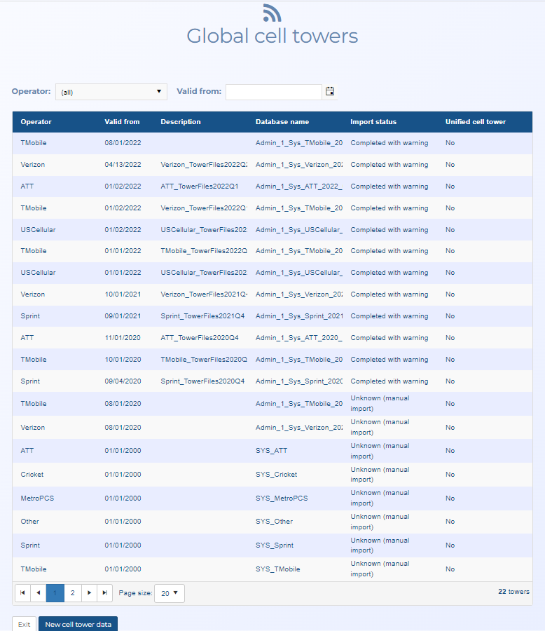 This topic provides an overview of the Global cell towers screen and all the settings and buttons on it. However if you require a step-by-step procedure on adding or deleting global cell tower data refer to Managing global and unified cell tower data.
