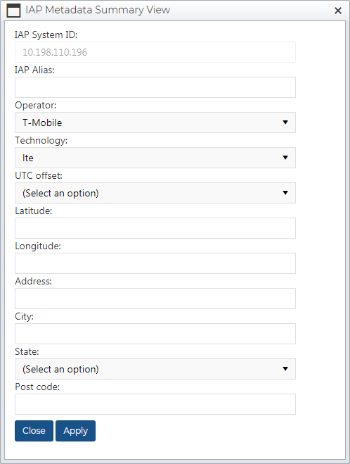 - View the IAP Metadata Summary View dialog box allows you to view the data for the selected IAP system ID.