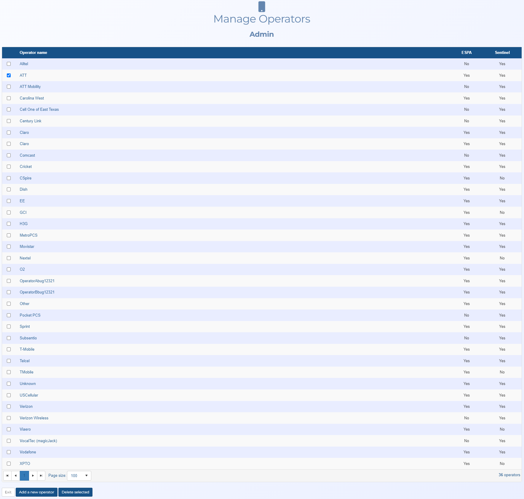Manage operators screen