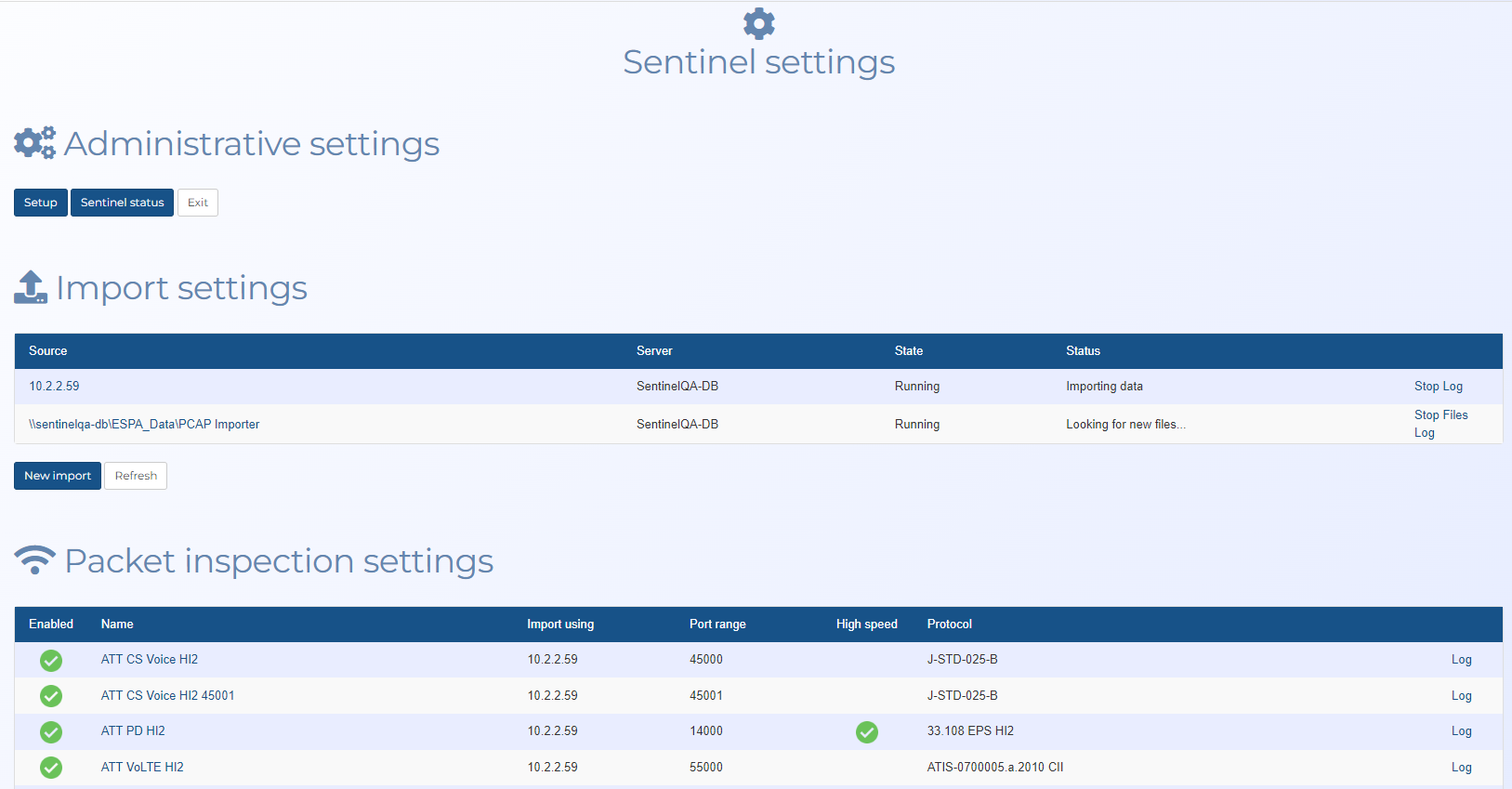 Click to open the Sentinel Status screen which is used to view or edit import and packet inspection processes and related logs.