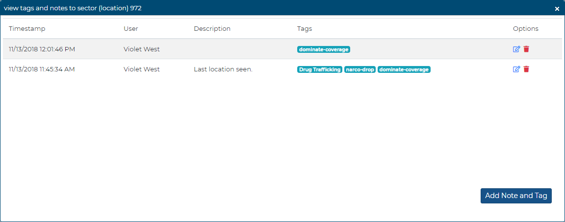 The View tags and notes dialog box allows you to view, edit and delete any tags and notes you have added to the Sentinel screen. You can add tags and notes to: a sector on the map and the rows on the Event summary view and the Message summary view. You can then: