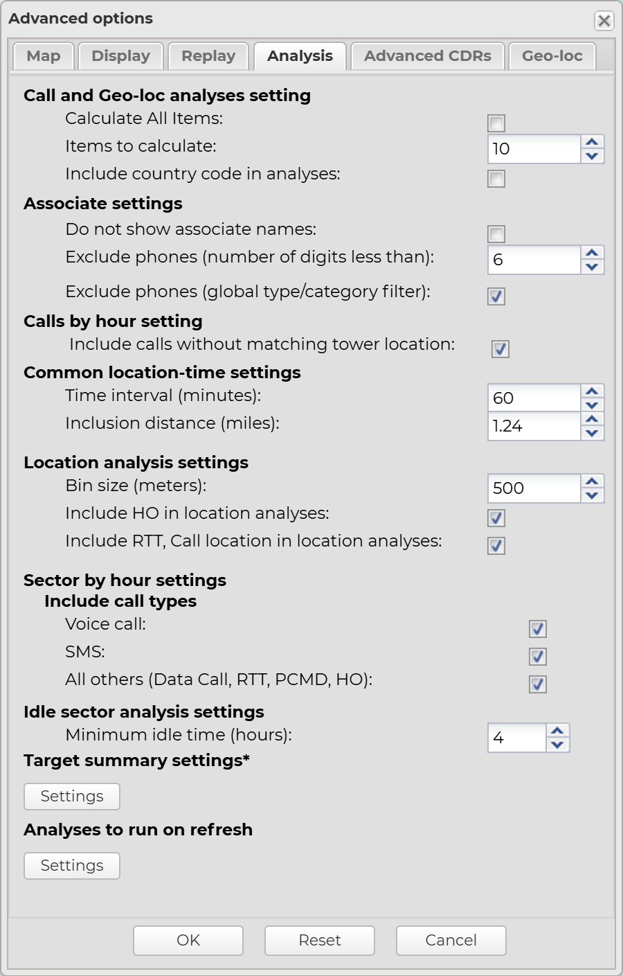 - The configuration of the call and geo-location analyses. The different analyses have different configuration settings available, however an example of one which is applicable to a multiple analyses is the number of items you want to include in your results.