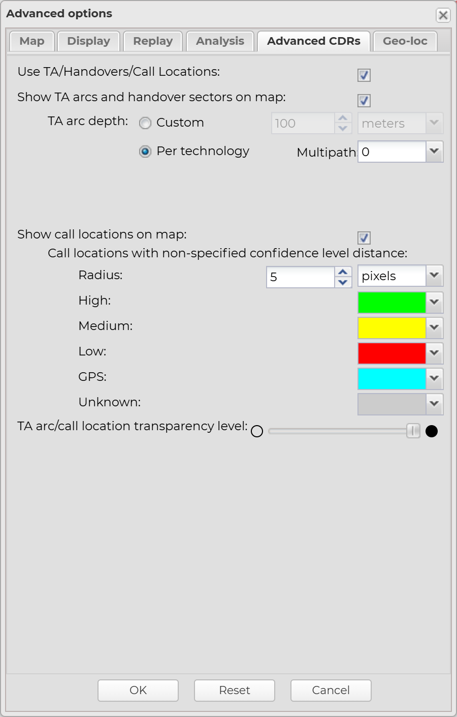 Note, you can also change the transparency level on an individual basis. For further information refer to either How to change an individual TA arc's properties or How to change the transparency level of an individual estimated call location. Any TA arcs or call locations which you have set an individual transparency level on are displayed with a combination of this default transparency level and the individual level. For example if the default setting is set to 50% and the individual setting is set to 50% the overall transparency is displayed as 25%.