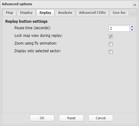Set the time interval between the changing of the records on the replay feature. The replay feature is available on the CDR data, Timeline and HO data tabs. For further information refer to Replay and Replaying movements on a tab.