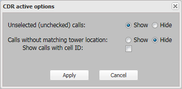 The CDR active options dialog box allows you to select what you want displayed on the CDR data tab. It allows you to select to either show or hide: unselected calls, and calls without correlating cell tower data for the CDR data that you currently have displayed in the CDR data tab. It also allows you to display uncorrelated calls where the only issue is due to the Cell ID not being available in the CDR file.