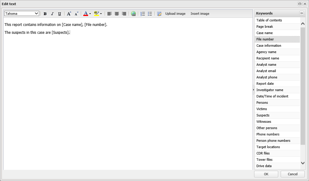 Double-click an item listed in Keywords to add it into your text. Keywords are items that have previously been defined in the settings of of the case. They are an efficient way of entering information into your report, for example you can enter all the suspect names by simply selecting the [Suspects] keyword. The keyword appears in the Add text, Edit text and Edit notes dialog boxes with [ ] around it, however when you run the report, the report will contain all the details for the keyword, for example in the case of the [Suspects] keyword it will list all the suspects names. These are useful to include in templates as all the basic case information is then included automatically.