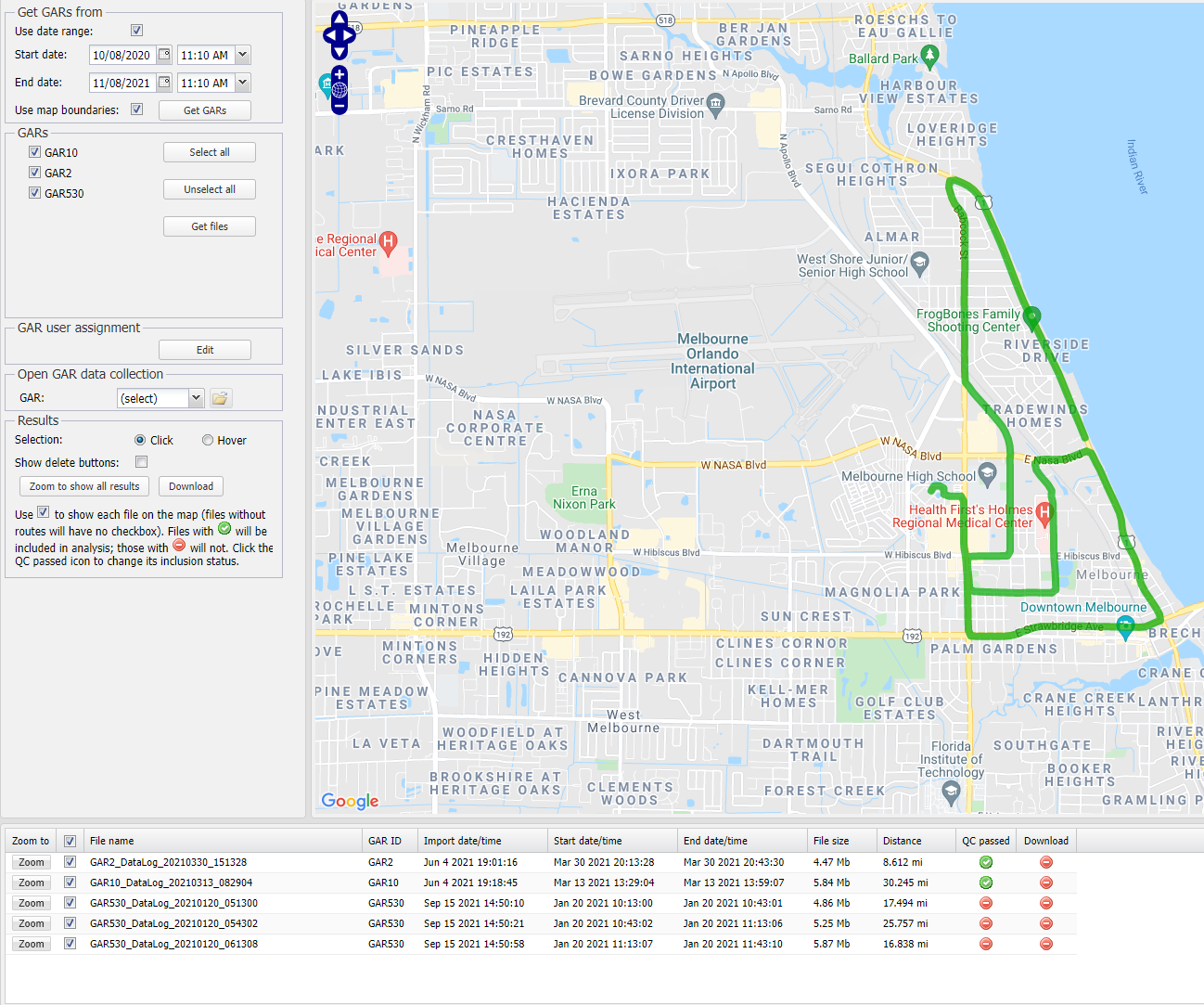 Click to retrieve all the drive data files for the GAR units you have selected. The files are then displayed on the Files panel.