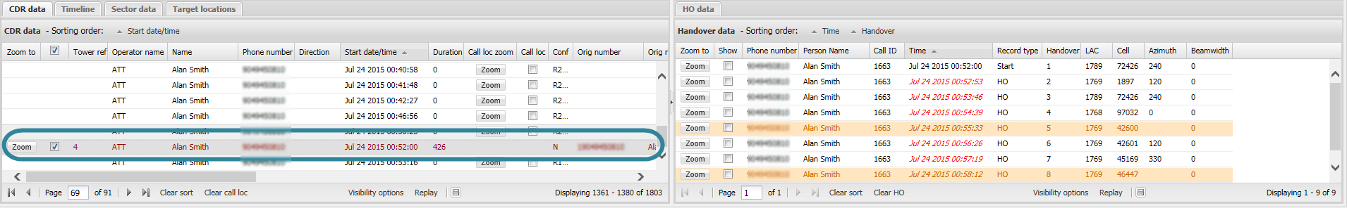The following graphic shows a CDR record that is selected on the CDR data tab (to select the CDR record click it and it will highlight in gray). The HO data tab only displays the handover data for the sectors associated with the selected CDR record.
