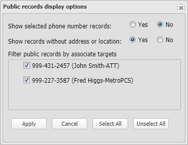 - whether to show all the public records or only to show those records associated with the phone numbers you currently have selected on either the CDR data tab, Timeline tab or the Call analyses tab.