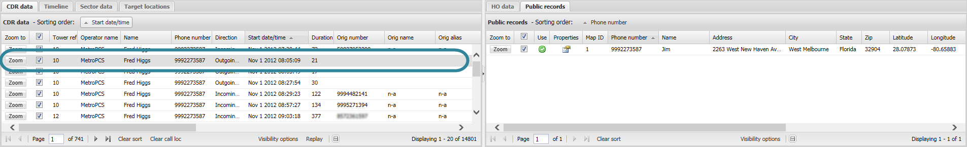 The following graphic shows a CDR record that is selected on the CDR data tab (to select the CDR record click it and it will highlight in gray). The Public records tab only displays the pubic records for the phone number associated with the selected CDR record.