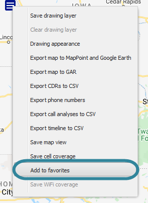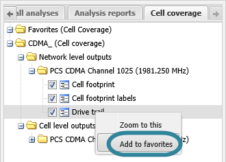 or right-click anywhere on the map to display the map menu then select Add to favorites. The cell coverage results that you currently have displayed on the map are added to the Favorites folder displayed at the top of the Cell coverage tab.