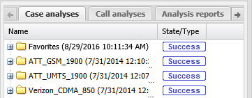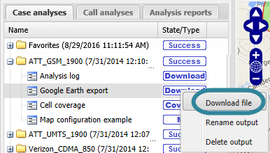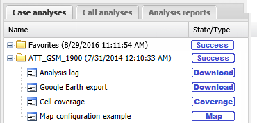 The Cell footprint analysis results are displayed on the ESPA analysis center screen's Case management view on the Case analyses tab. By default the analysis generates the cell coverage and also an analysis log download. From the Case analyses tab you can open the cell coverage result. The cell coverage details open on the Cell coverage tab where you can select which components of the cell coverage you want displayed on the map. You can open multiple cell coverage results on the Cell coverage tab at any one time allowing you to view the cell coverage from multiple operators and multiple technologies. You can also add cell coverage results that are of significant interest into a Favorites folder. If you require an overview of these tabs or a detailed description of their settings refer to the Call analyses tab and the Cell coverage tab.