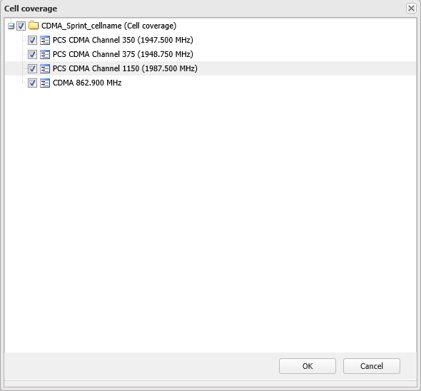 , then select from the menu the cell coverage result you want to display then click the sector that you are interested in. For further information on each of the cell coverage selections refer to Cell coverage tab.If you have more than one analysis open on the Cell coverage tab or more than one channel that provides cell coverage for the selected sector then the Cell coverage dialog box opens allowing you to select the coverage analysis of interest.