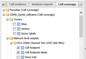 For GSM the Cell footprint and the Cell footprint labels are selected by default and are automatically displayed on the map. For other technologies, unless you only selected one channel/frequency for your cell footprint analysis, you must select the cell footprint and cell footprint labels for the channel/frequency that you want to display on the map.