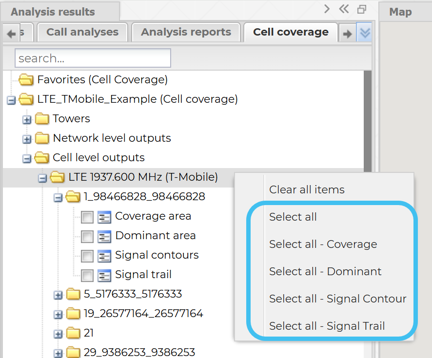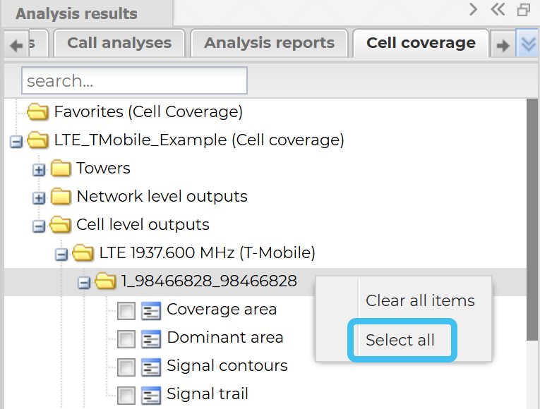 Select all - Coverage, Select all - Dominant, Select all - Signal Contour and Select all - Signal Trail are available on the cell level output parent folder and the Favorites folder.