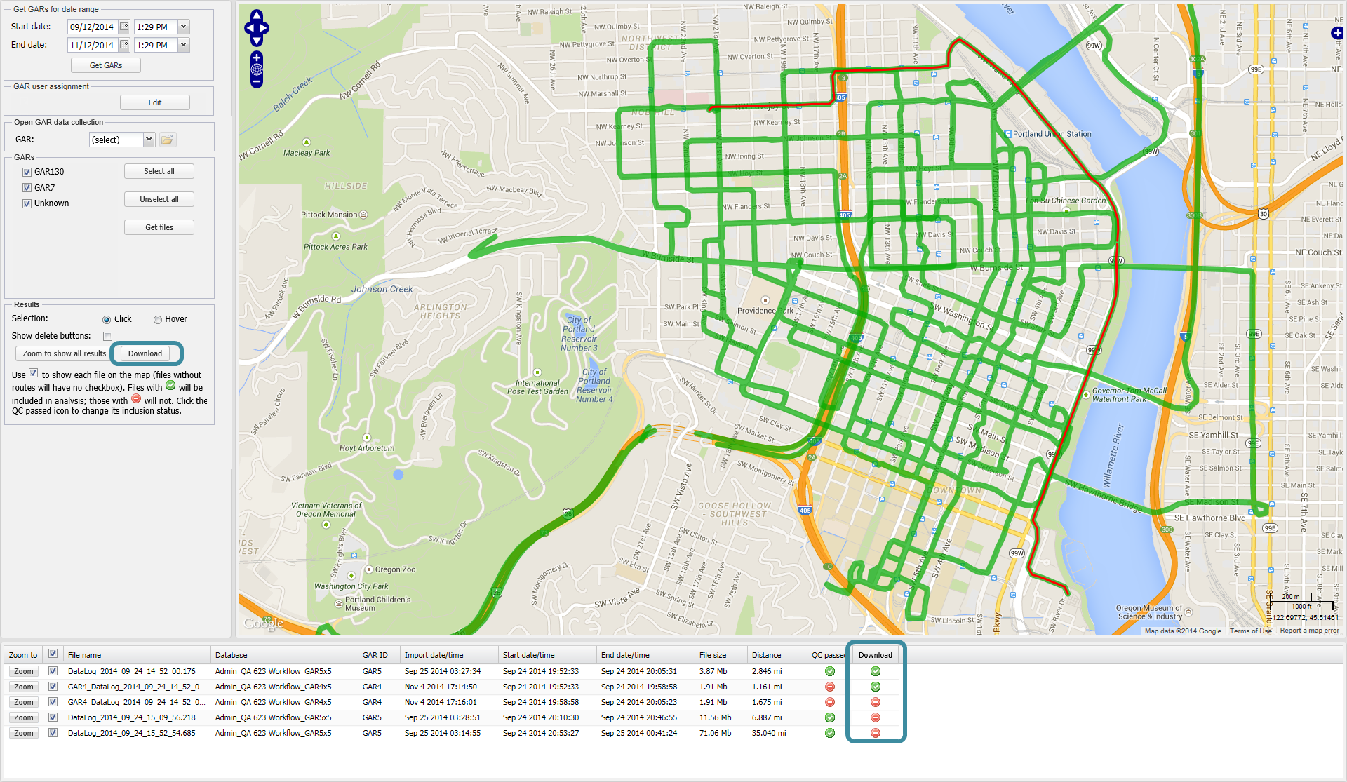 The screen is updated to display all the drive data files for the date range and GAR units you selected.